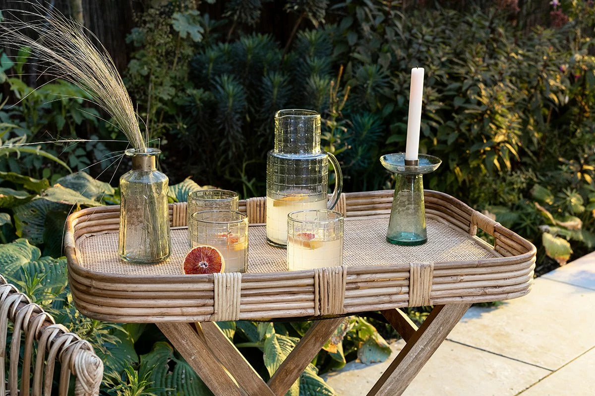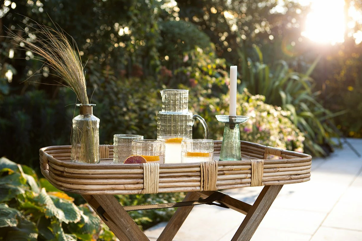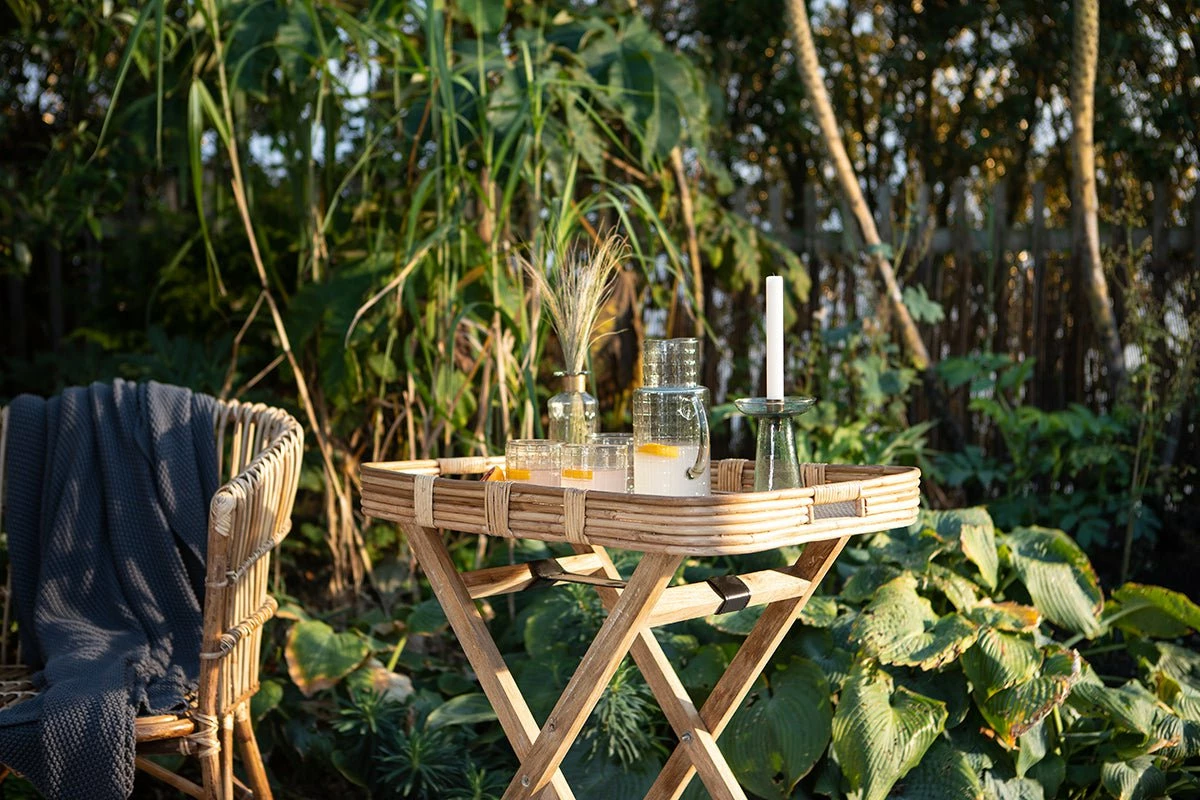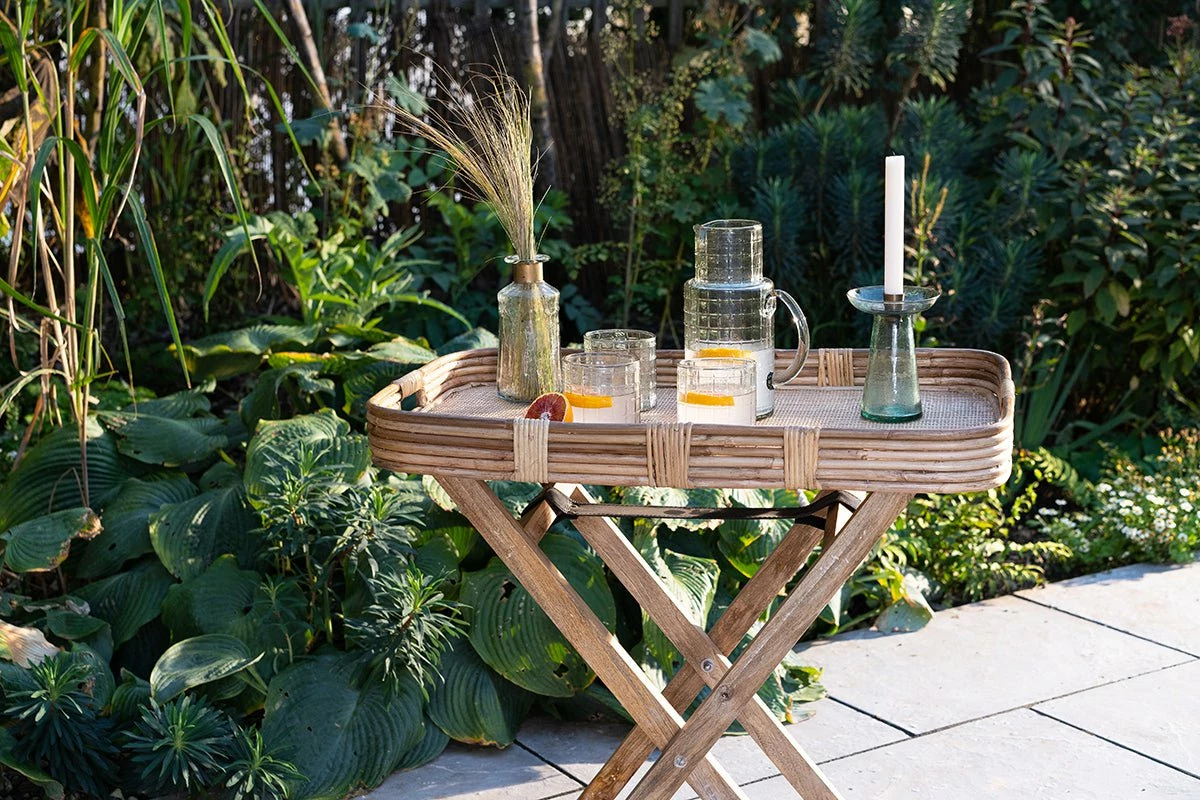 The Alanchi tray table is based on a traditional butlers stand but with a more generously proportioned tray top. The light tones of the rattan provide an elevated and relaxed feel. This is the perfect piece for creating your own drinks table with plenty of space for glasses and bottles. The tray is sturdy and well made and slots neatly onto the mango wood leg frame. Its versatile construction gives it a playful and practical quality, ideal for use in the garden or an indoor living space. The Alanchi table is not suitable to be left outdoors but its design makes it easy to transport inside and out.