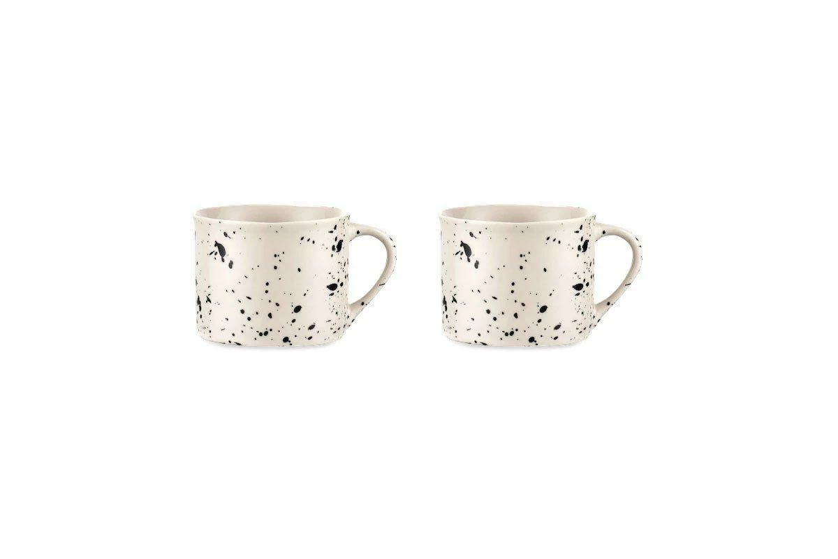 These artisan made Ama short coffee mugs are decorated with a black splatter affect. This eye-catching design is created by hand. These stylish mugs have a smooth glaze finish and tactile quality.