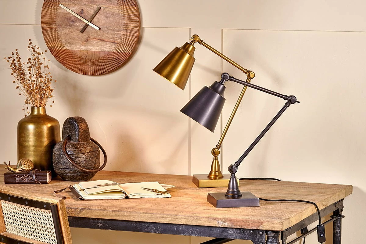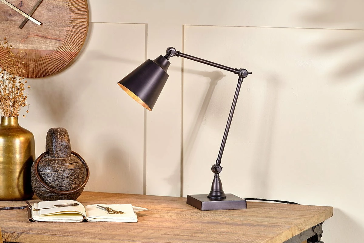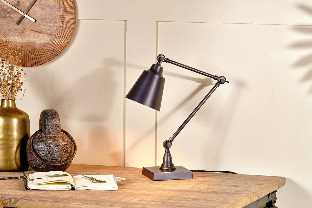 The warm industrial look of the Bakir bronze metal desk lamp make it an easy addition to a home office. A task desk lamp is ideal in focusing light in a specific direction. The opaque shade means that the light is directed downwards. The adjustable arm allows for further positioning. A desk lamp height should be set below eye level. This prevents the light from directly hitting the eyes. The lamp should be placed on the opposite side of the hand you write with: the right side for left-handed people and the left side for right-handed people. This is to prevent shadows on the worktop while you write.