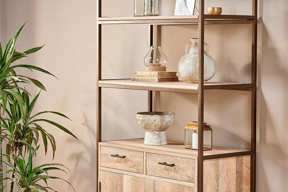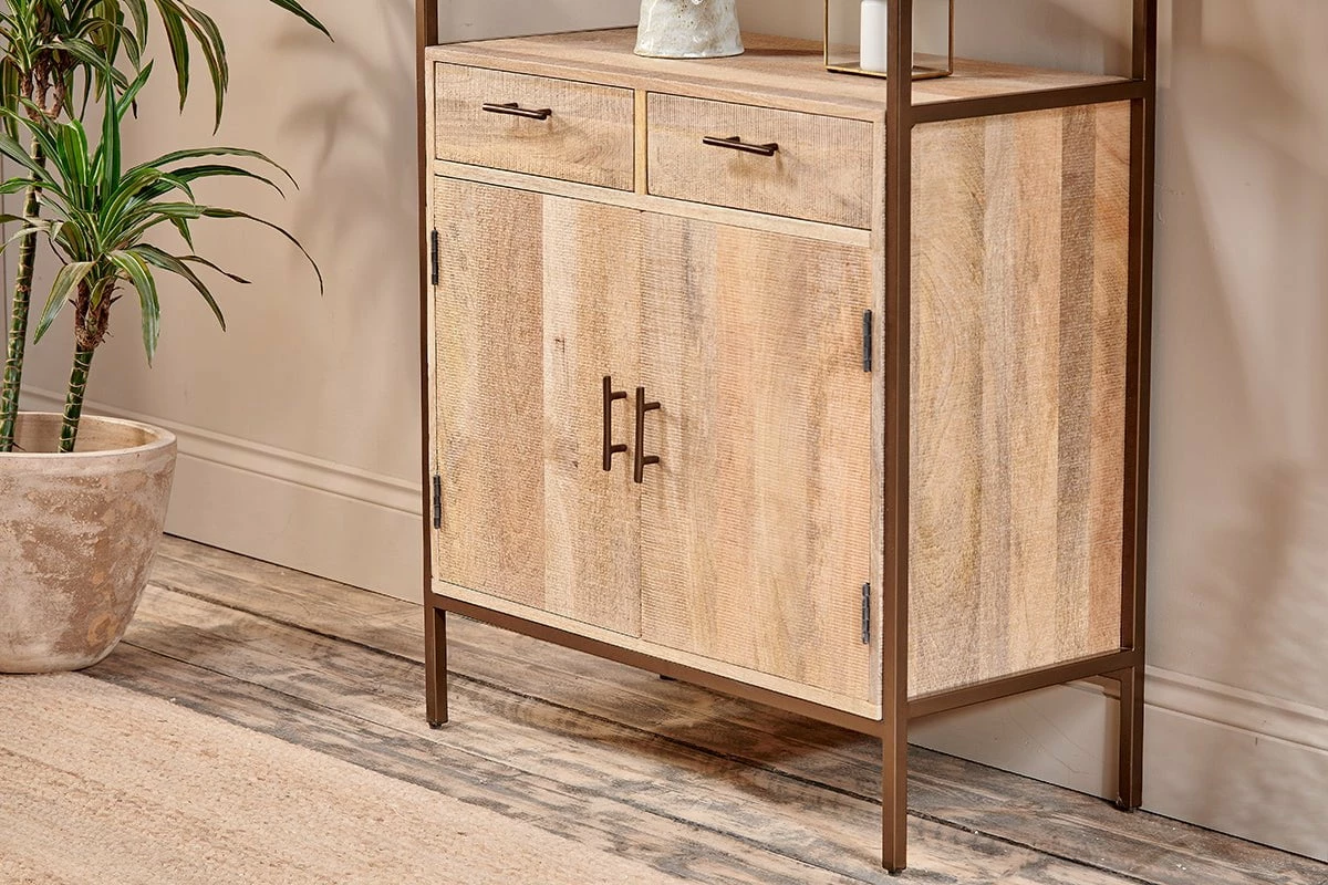 The Dasai mango wood storage unit is an extremely versatile piece of furniture. It works equally well in a kitchen, holding crockery and glassware, or as a backdrop for books and home décor in a living room or home office. The unit has been crafted from sustainable mango wood that has been sandblasted to enhance its natural patina and achieve a rich textured finish. The Dasai storage unit features two practical cupboard doors that open to reveal a single wooden shelf. Two drawers sit above this, as well as three open shelves that offer practical areas for display and storage. The unit features hand forged, rolled iron handles that mirror its sleek iron frame.
