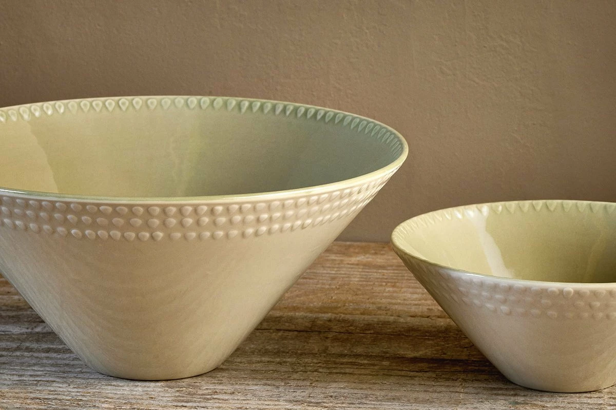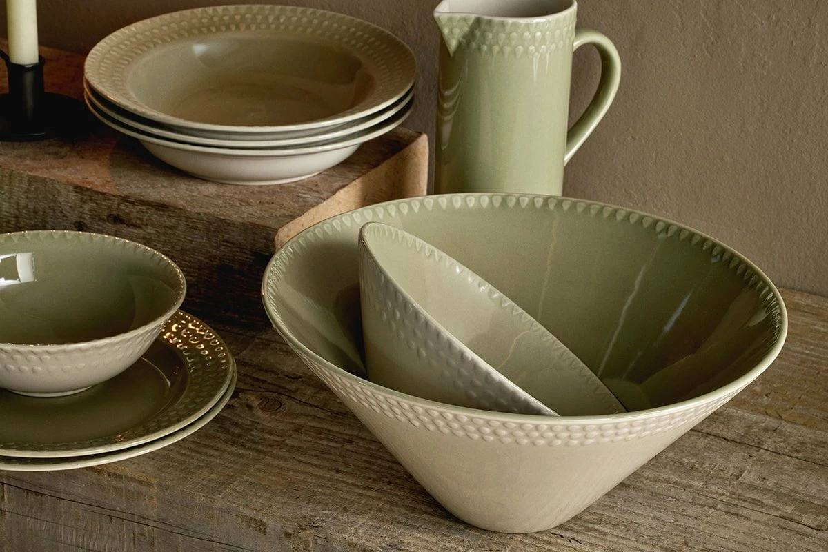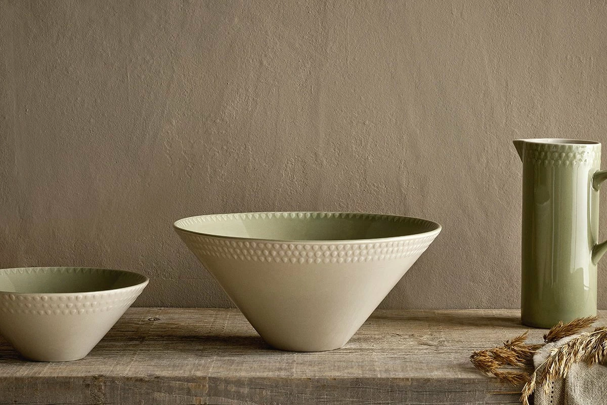 Ideal for sharing salads, pasta dishes or hearty stews, our generously proportioned Ela serving bowl in stylish sage green looks beautiful as part of your tabletop. A subtle droplet pattern has been added to the top of the bowl using specialised techniques, which results in a product with its own individual character. The pattern also brings an appealing tactile quality, adding another layer of interest. Style with the rest of the Ela collection for a harmonious tabletop.