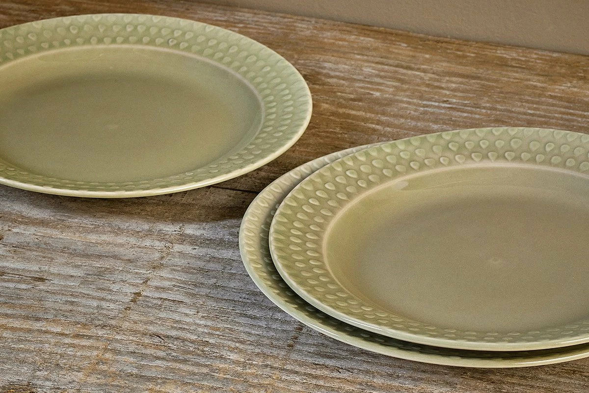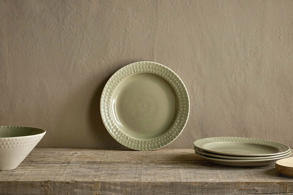 Elegant and stylish, our Ela side plate in sophisticated sage green has a beautiful raised droplet pattern embossed around the rim. Its design perfectly illustrates the skill and experience of the artisans, who used traditional techniques to create the embossed droplets. The result is a plate with its own distinctive character, as no two patterns are the same, and an appealing tactile quality. Style with the rest of the Ela collection for a harmonious tabletop.