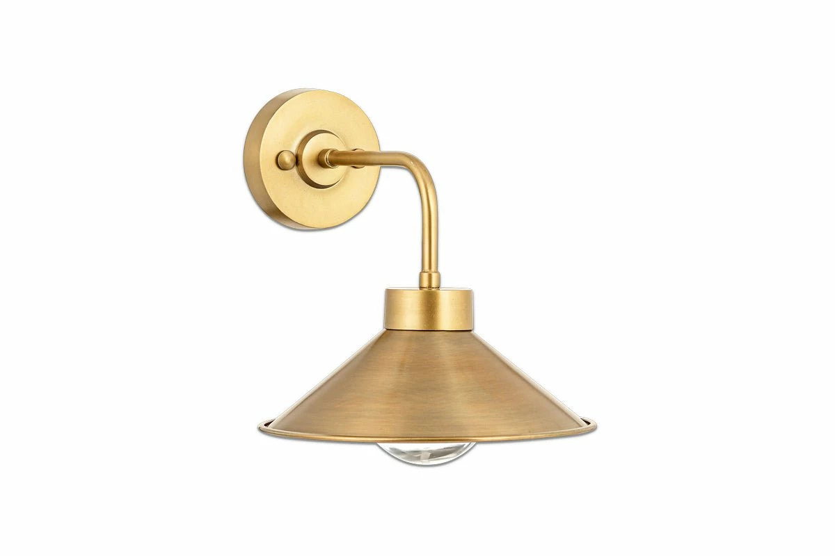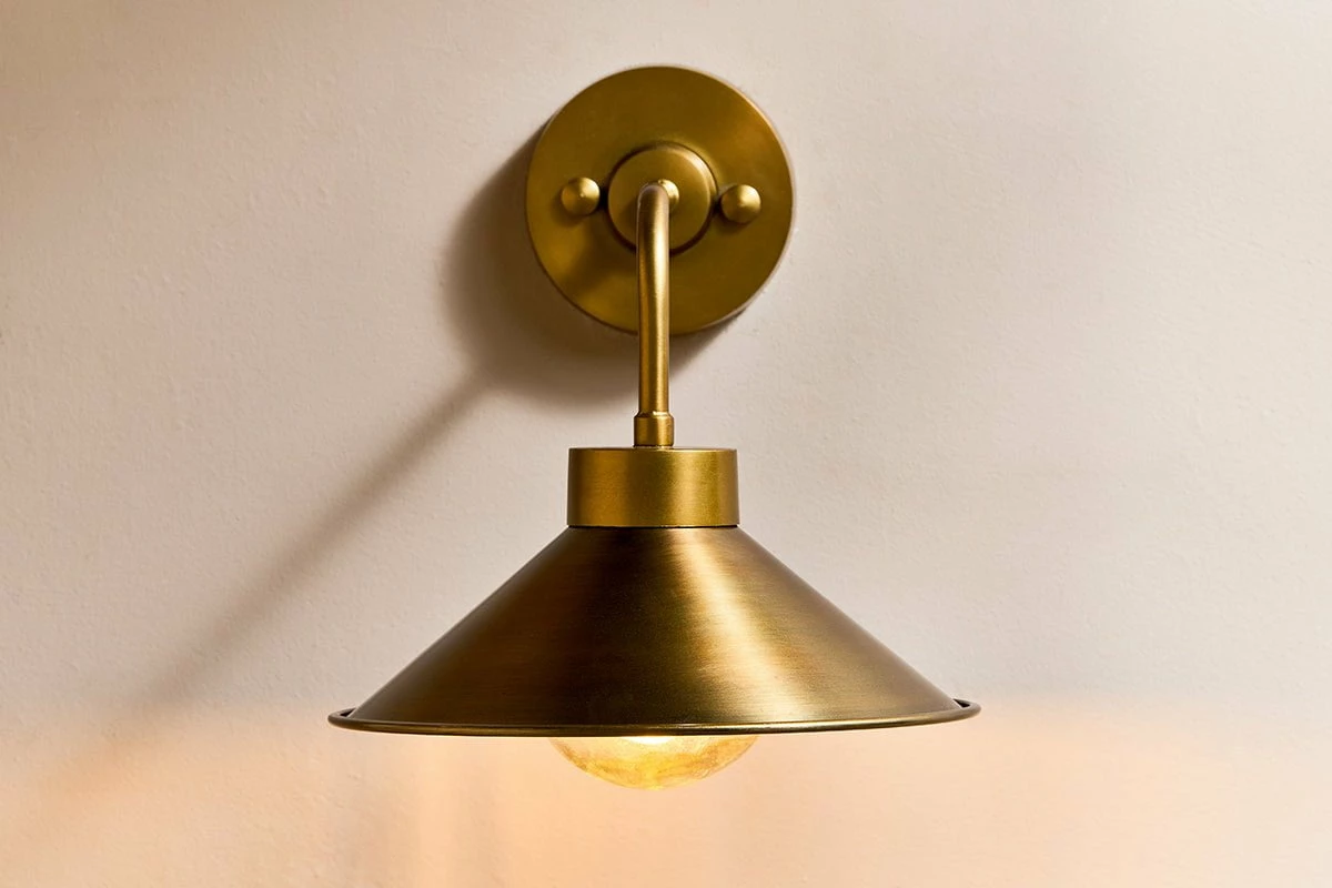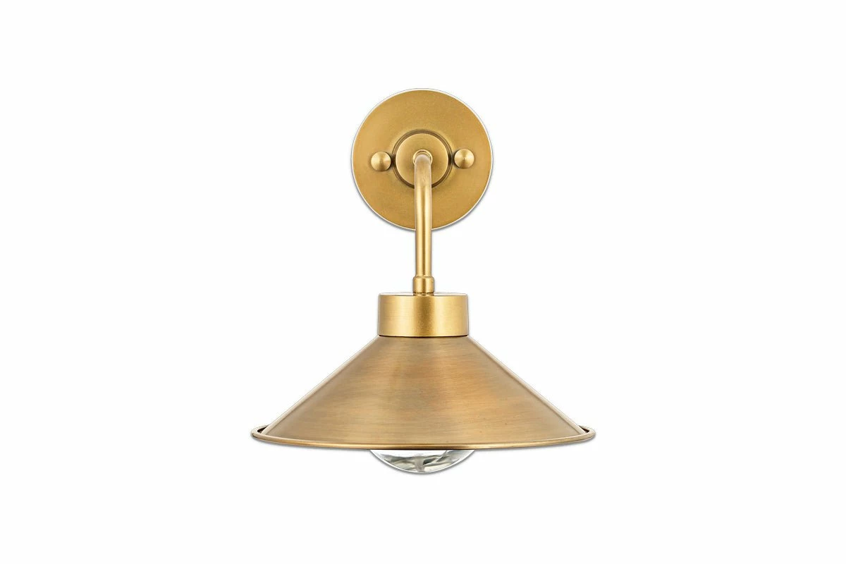The Galgao bathroom wall light has an attractive cone shaped antique brass shade and clear glass globe. Antique brass and glass are timeless materials that display elegantly together. The globe has a hammered finish that provides a soft diffusion of light. The Galgao works well in pairs, in a traditional format either side of a mirror.