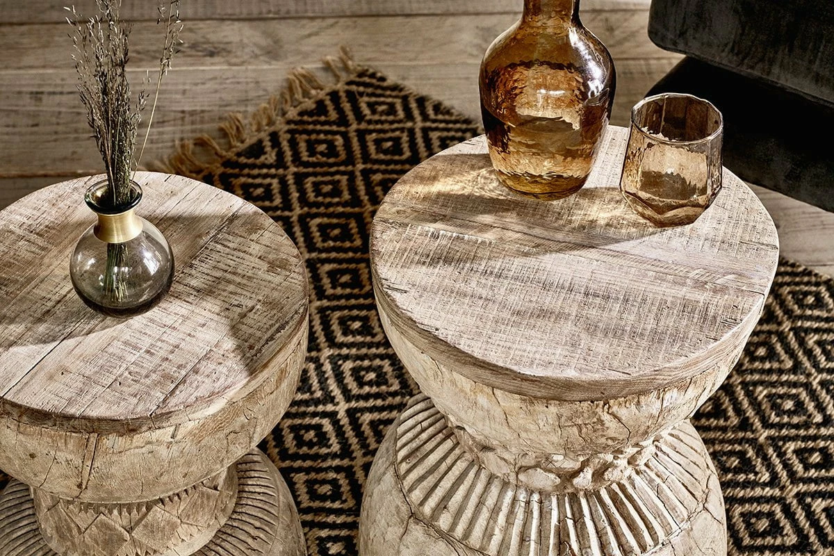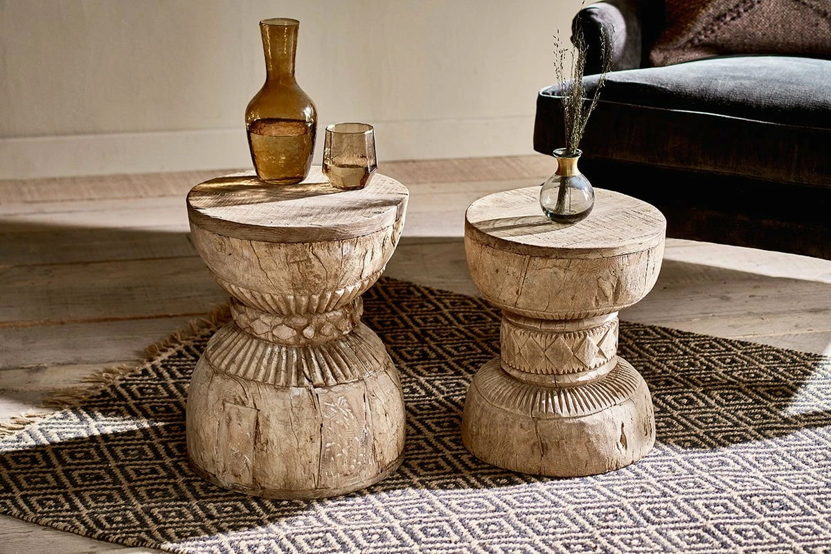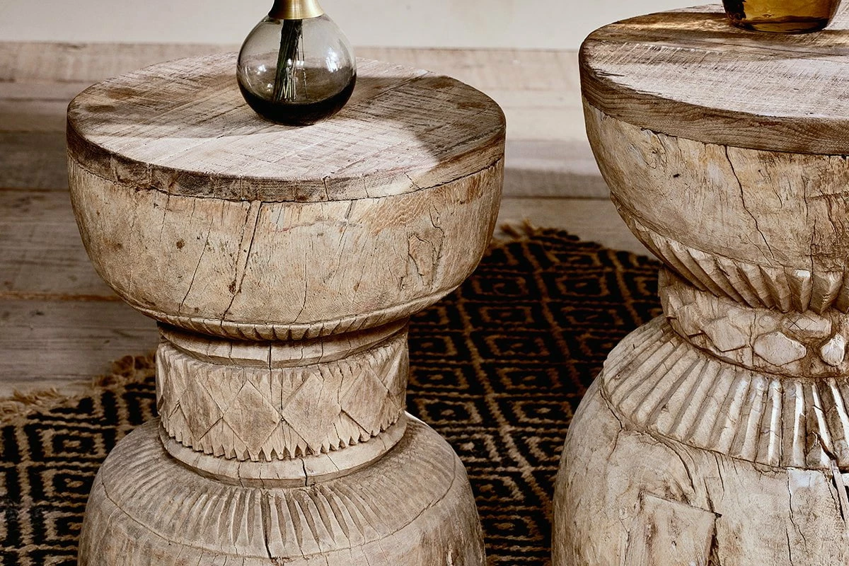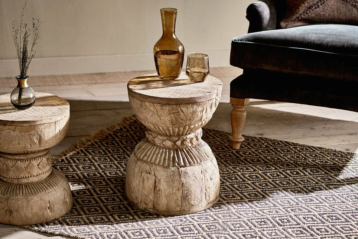 Our Kashba side table is truly striking. Crafted from reclaimed wood, each one is unique. Its eye-catching curved design is both practical and stylish, with a rustic aesthetic and distinctive carved pattern. Our use of reclaimed wood means every table has its own individual look and feel, with interesting markings and slight imperfections from the wood’s previous use. Due to the traditional way these tables have been created, there are notable differences in its size which adds to their character.
