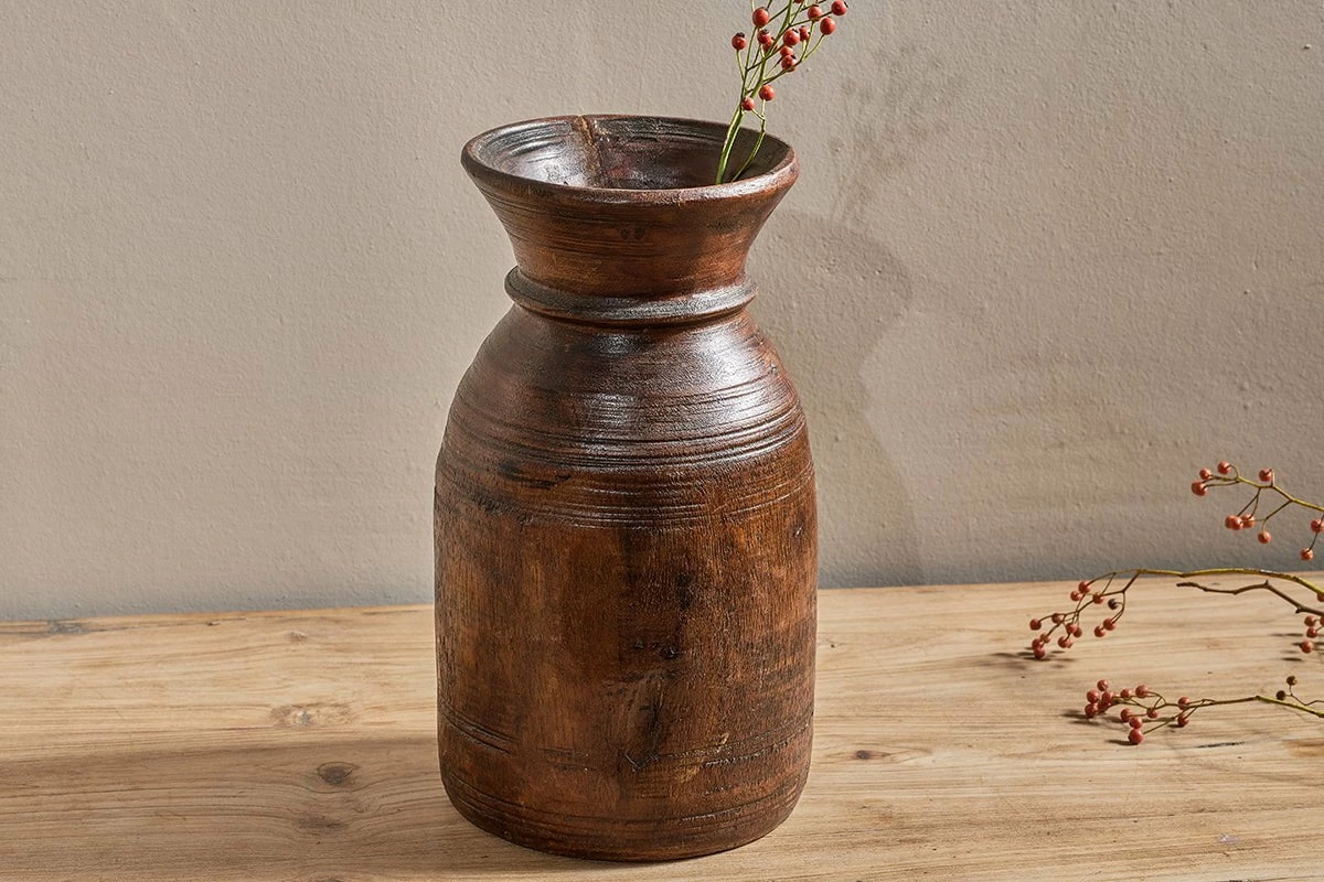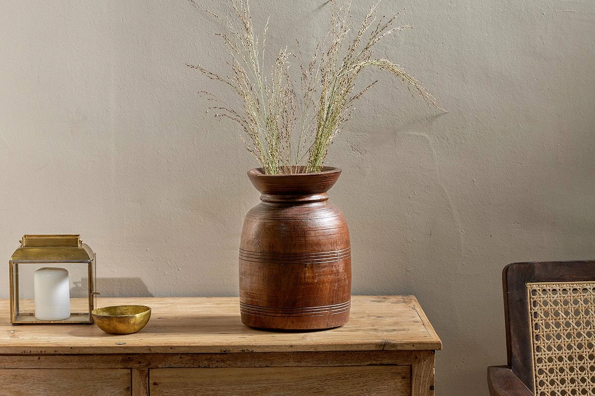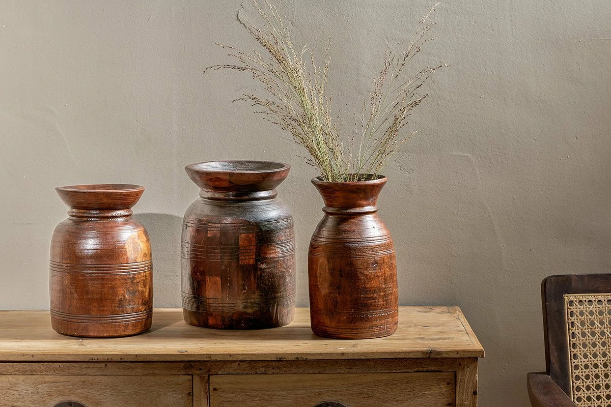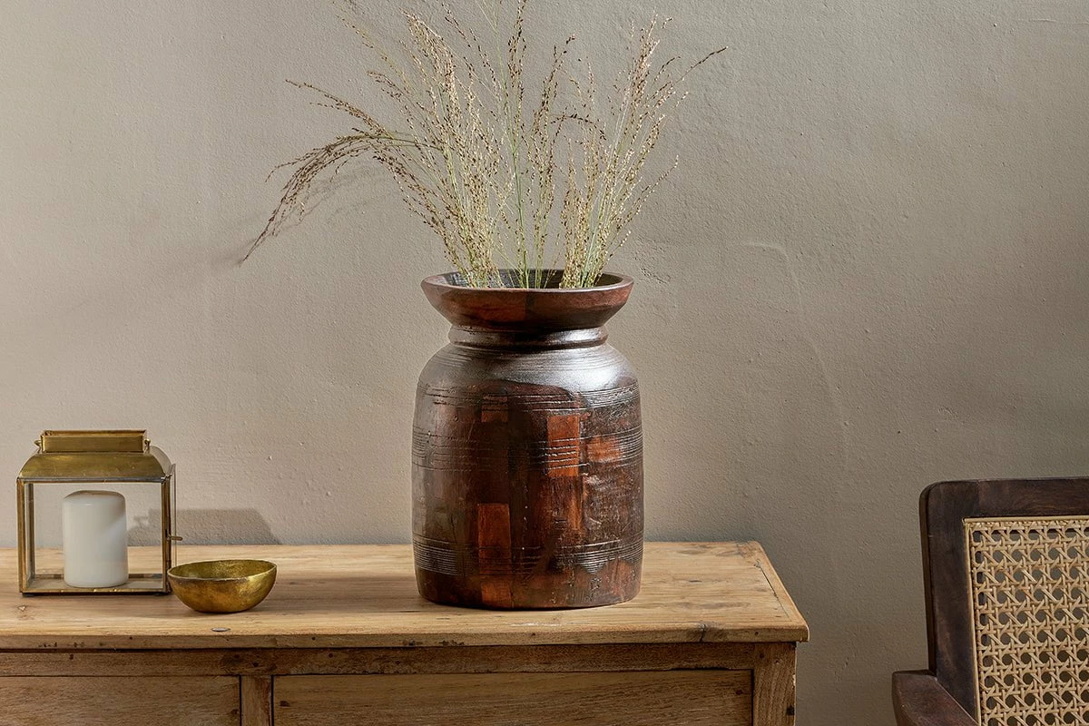The Kawasan reclaimed tall wooden pot has an appealing dark antique tone. These reclaimed pots make an easy way to add character, texture and tone to a display. Traditionally, the Kawasan was used to store milk and honey; the pots were originally handcarved in different shapes with varying design details carved into their exterior. The reclaimed nature of the Kawasan means that there is a variation between each one, sometimes one is a little wider or a little taller. This adds to their unique charm.