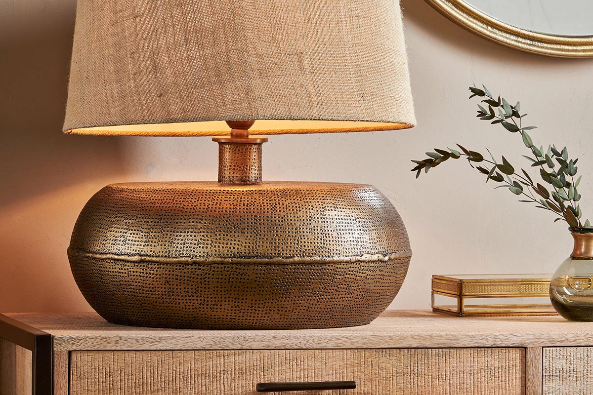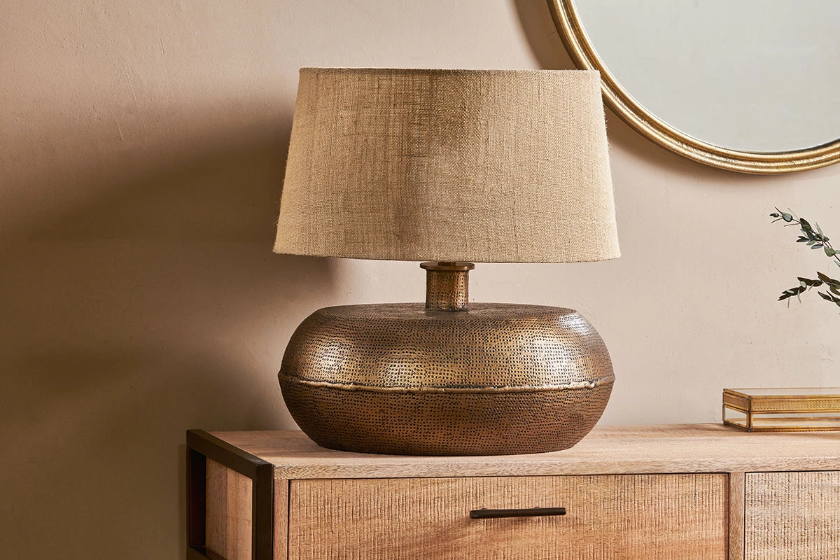 The Lumbu lamp has an interesting antique appearance derived from the honest, artisan techniques used to create it. The antique – brass finish enhances the tactile pattern in an understated and stylish manner. Each lamp comes with a brown fabric cord. Complete the look with one our attractive lampshades.