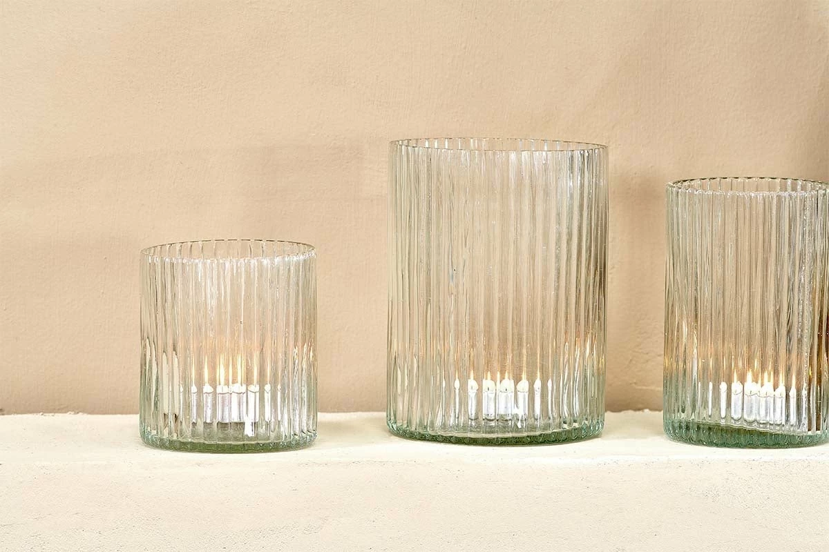 Set an ambient mood with our Malana candle holders. The ribbed detailing of the recycled glass they’re made from looks beautiful and creates the perfect soft filter for natural candlelight.