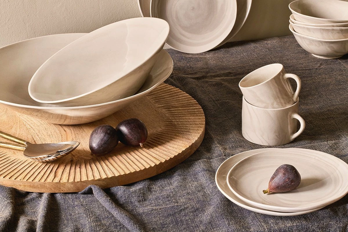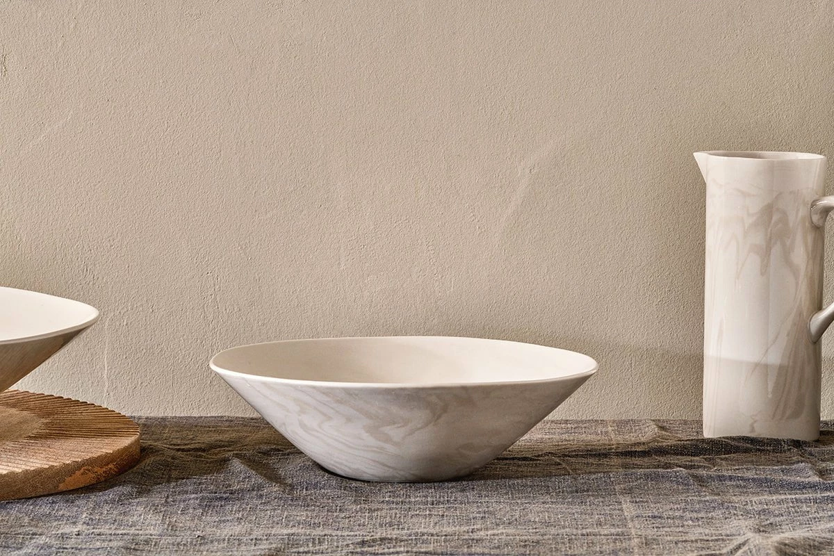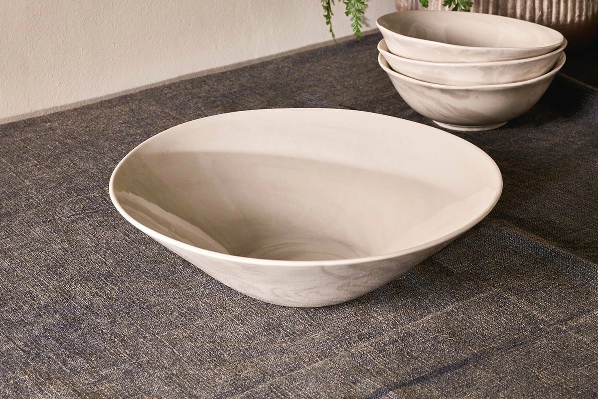 The beautiful marbled design of our Maya serving bowl makes it a truly eye-catching addition to your tabletop. Its striking appearance is entirely natural and has been crafted using traditional techniques, combining dark and light clay to create a bold organic aesthetic. With its sophisticated shape and practical proportions, the Maya bowl is perfect for side salads, pudding or vegetable accompaniments. Style with the rest of the Maya collection for a characterful dining set.