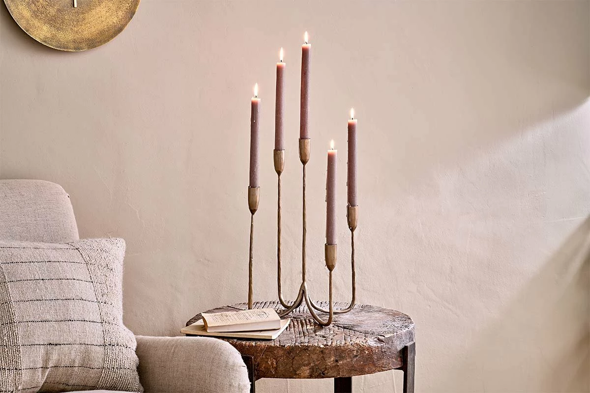 The Mbata cluster candelabra has a discerning design that is ideal as table centre piece or sideboard feature. Hand forged from iron and finished in an elegant aged brass tone; the five candles holders are positioned at varying heights.