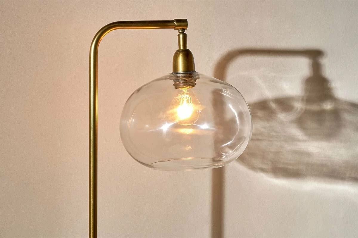The stylish Mulia glass floor lamp boasts an organically shaped glass shade and elegant antique brass stand. The stunning circular shade creates a unique feature, even when the lamp is switched off. However, when you do turn the lamp on, the warm brass of the circular base and single solid stem shines beautifully, making this a stunning piece.