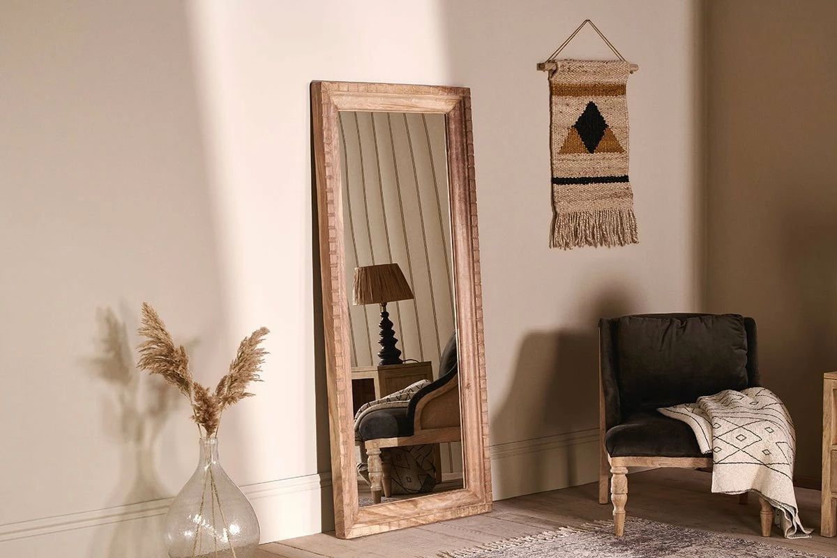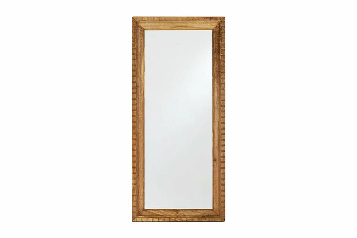 This elegant full length mirror has a pared back, organic aesthetic thanks to its beautiful bevelled wood frame and classic rectangular shape. The frame is crafted from reclaimed wood, which is not only more sustainable than new wood, it means each piece has its own distinctive character. A simple pattern, carved into the frame by hand, enhances the understated look and feel. Use to create the illusion of extra light and space, as well as to check your appearance.