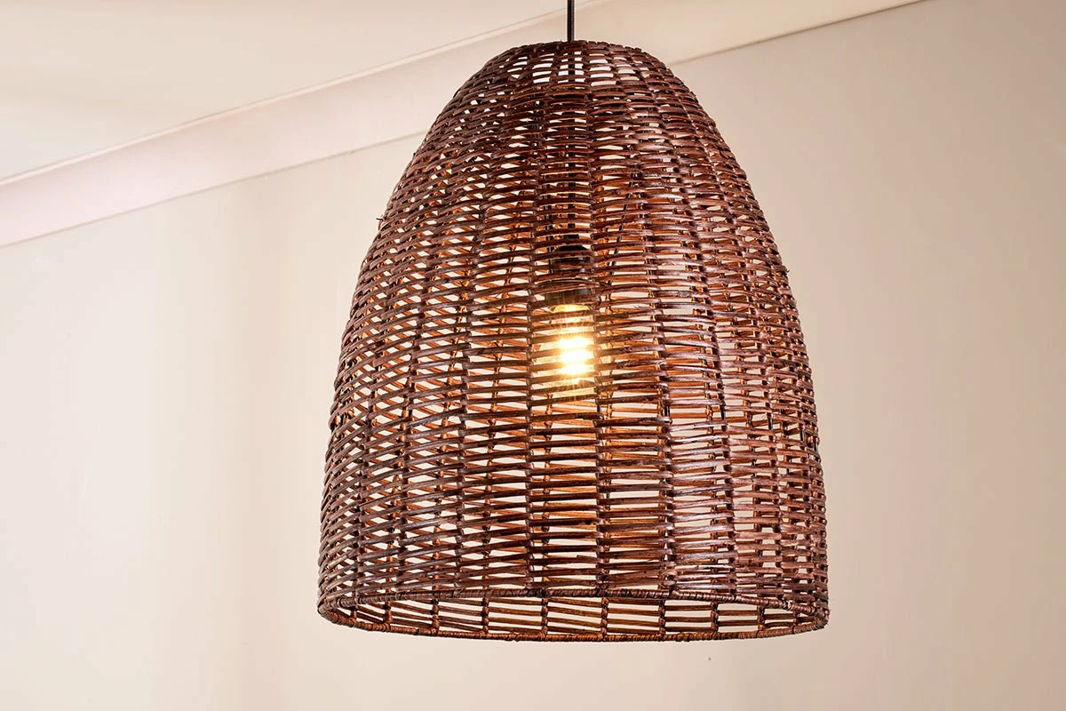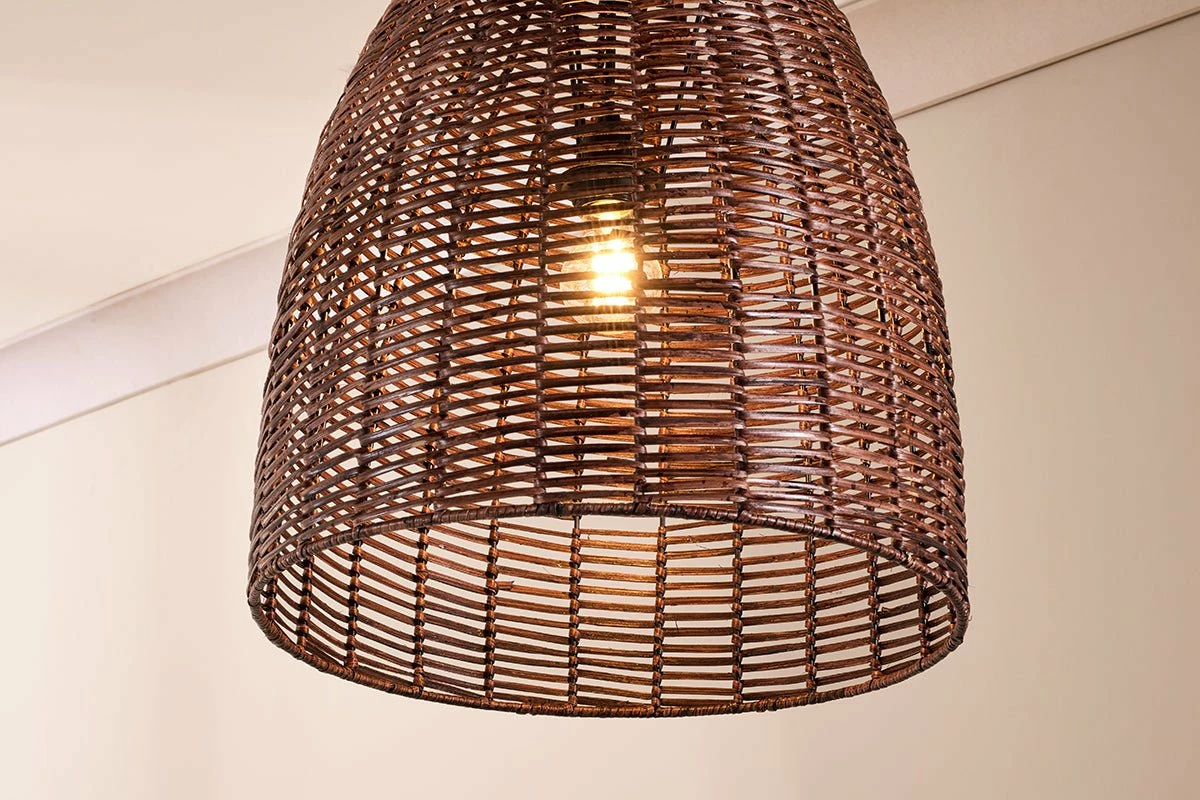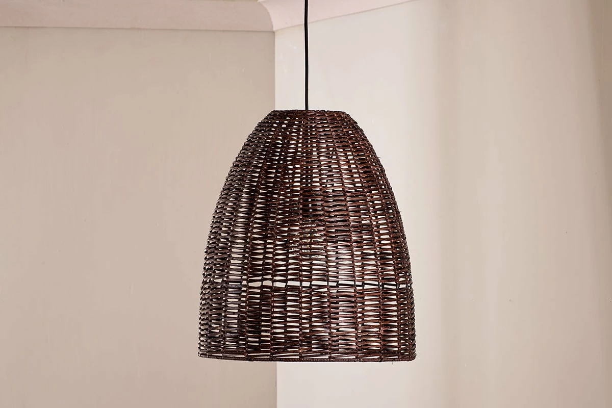 The conical dark rattan Noko pendant light has an appealing dark brown tone. The darker stain fuses perfectly with the natural rattan and suits the modern conical shape of the pendant light. Dark tones style well in a home providing a contrasting tonal colour. The woven pattern of the Noko has an appealing tangable quality that feels fresh and summery; bringing a soothing natural material into the home and elevating a living space with softly diffused light.