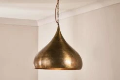 The Quinn statement metal pendant light is crafted from aluminium and finished with a rich antique brass tone. The metal has a characterful textured hammered finish that is carefully created using hand tools. The Quinn pendant light has a feeling of being discovered, the brass tones and textured pattern feel authentic and interesting. We love the wide shape of this statement light, its generous size ensures light spills downwards and outwards making it perfect to place above a dining table or as central feature in a living space. The Quinn is finished with a rust coloured fabric cable and co-ordinating antique brass ceiling rose. This is an impressive light that would make a great showpiece.