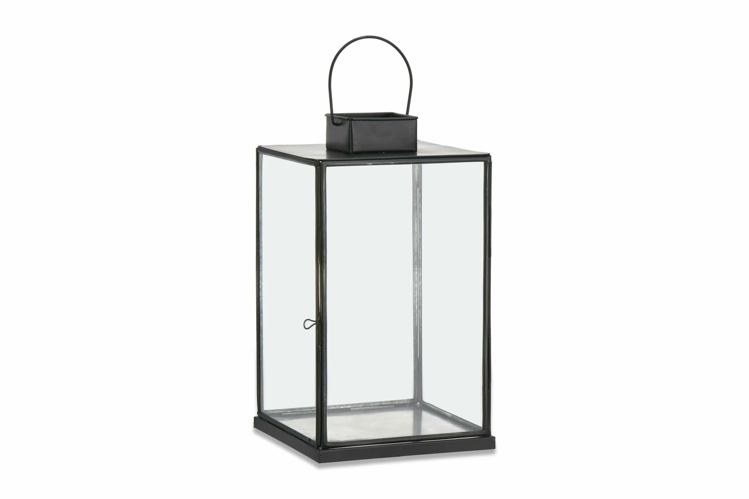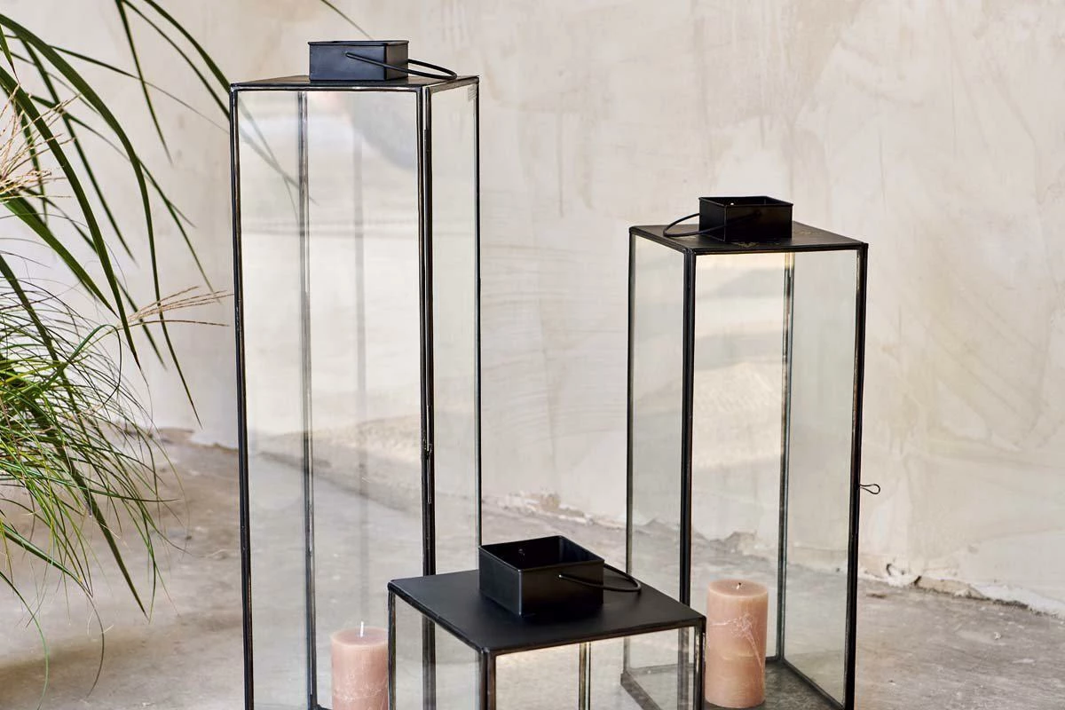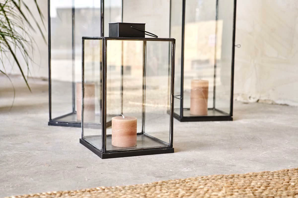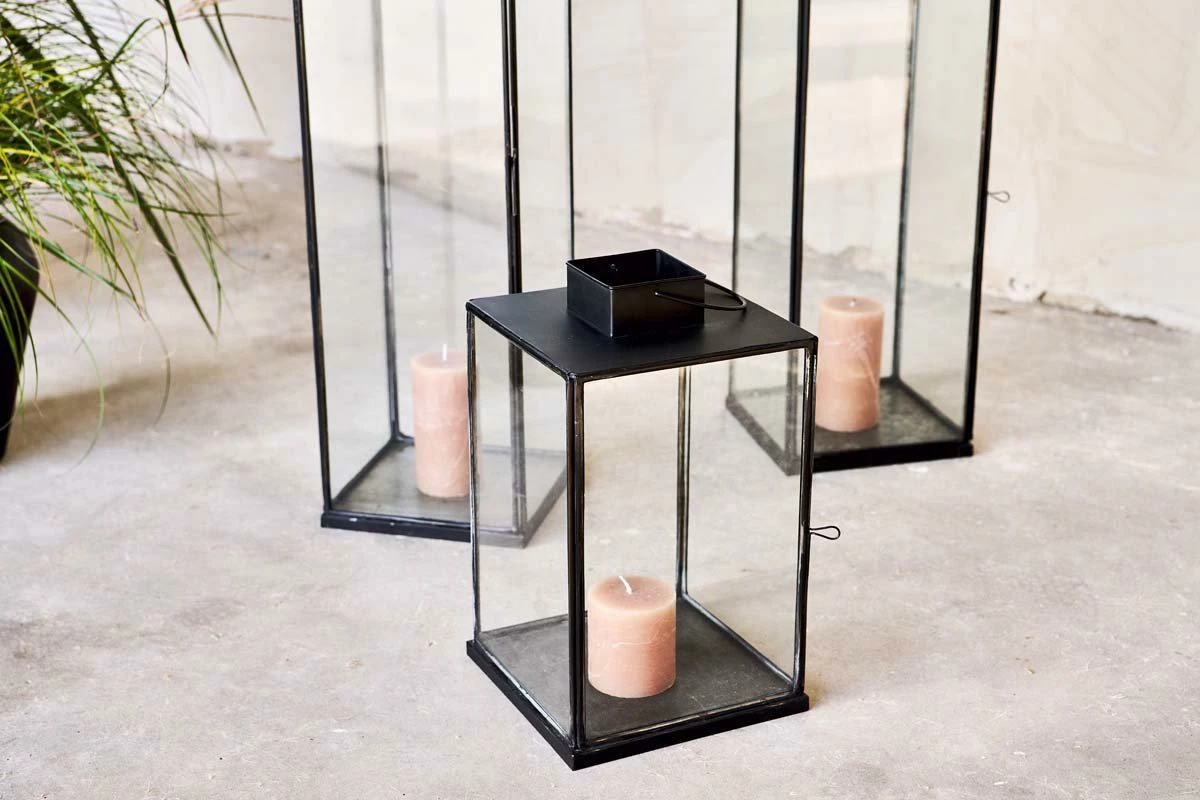 The elegant contours of our Sia lantern is enhanced with the antique black metal finish. This striking frame holds the tall glass panels and provides the perfect silhouette for a church candle or t-light.