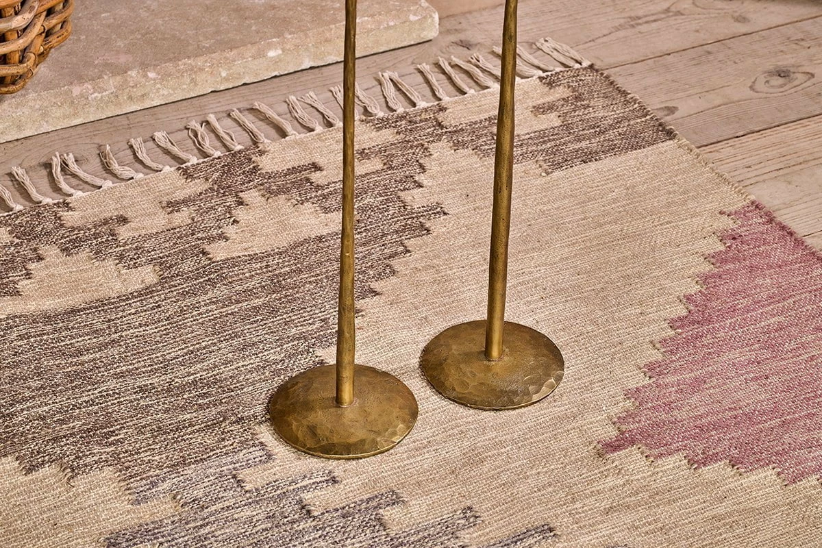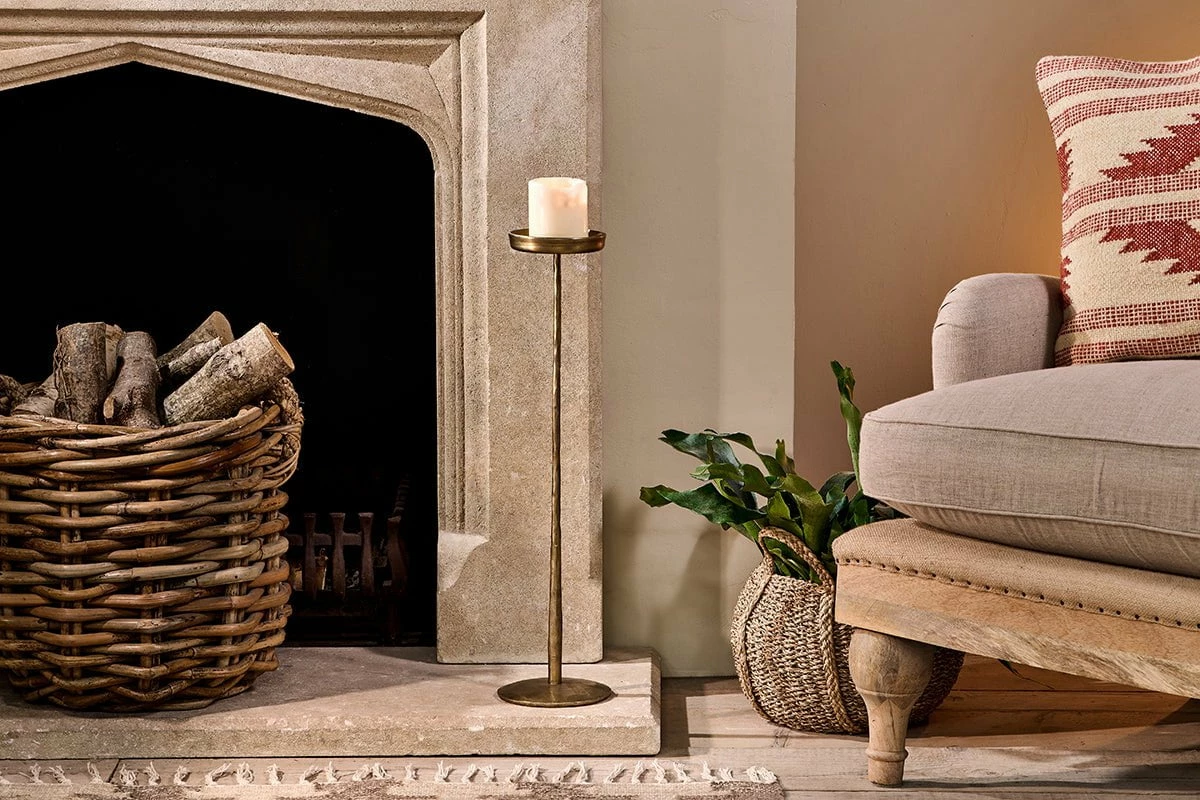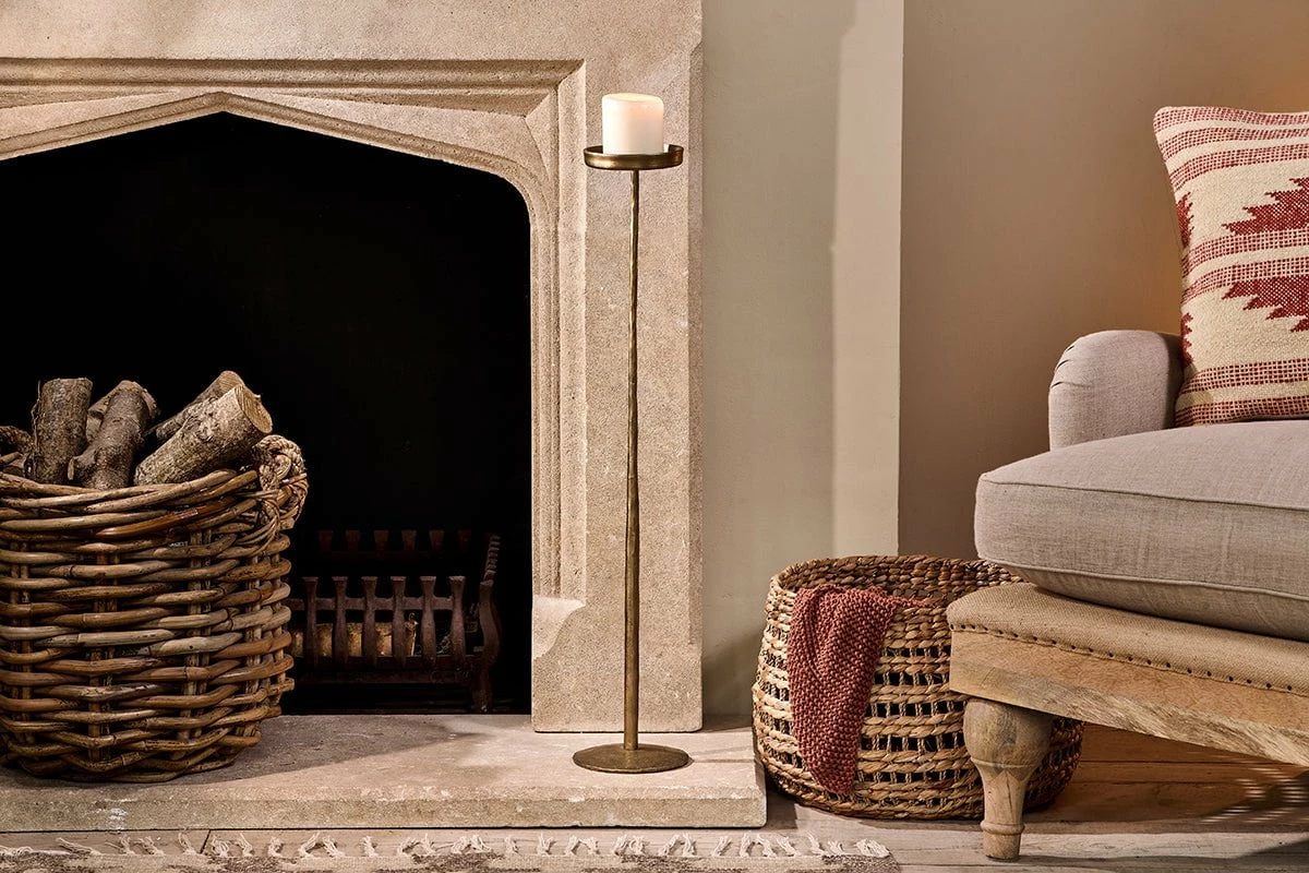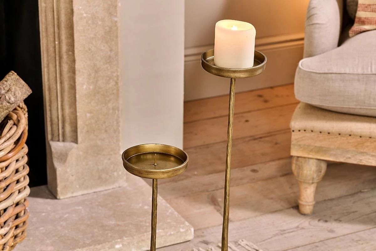 Our Sundra candle stand makes a sophisticated statement. The saucer-shaped candle holder, perfectly suited to a pillar candle, allows the candle to be completely on display while the tall, elegant stem is truly eye-catching. Although it looks delicate, it’s crafted from forged cast iron and has a weighted base for extra stability. Its rustic antique brass finish was skillfully created during the soldering process. Style next to your fireplace for a beautiful display. Available in two sizes.