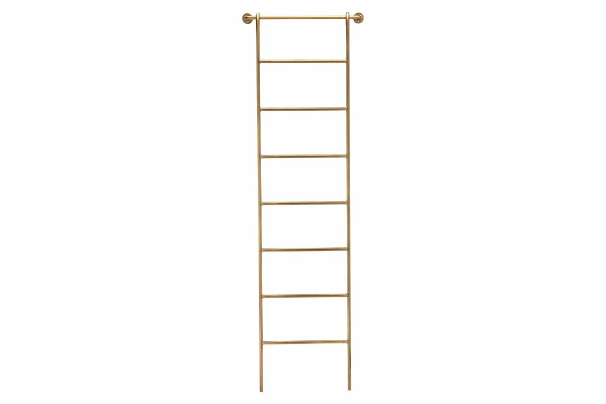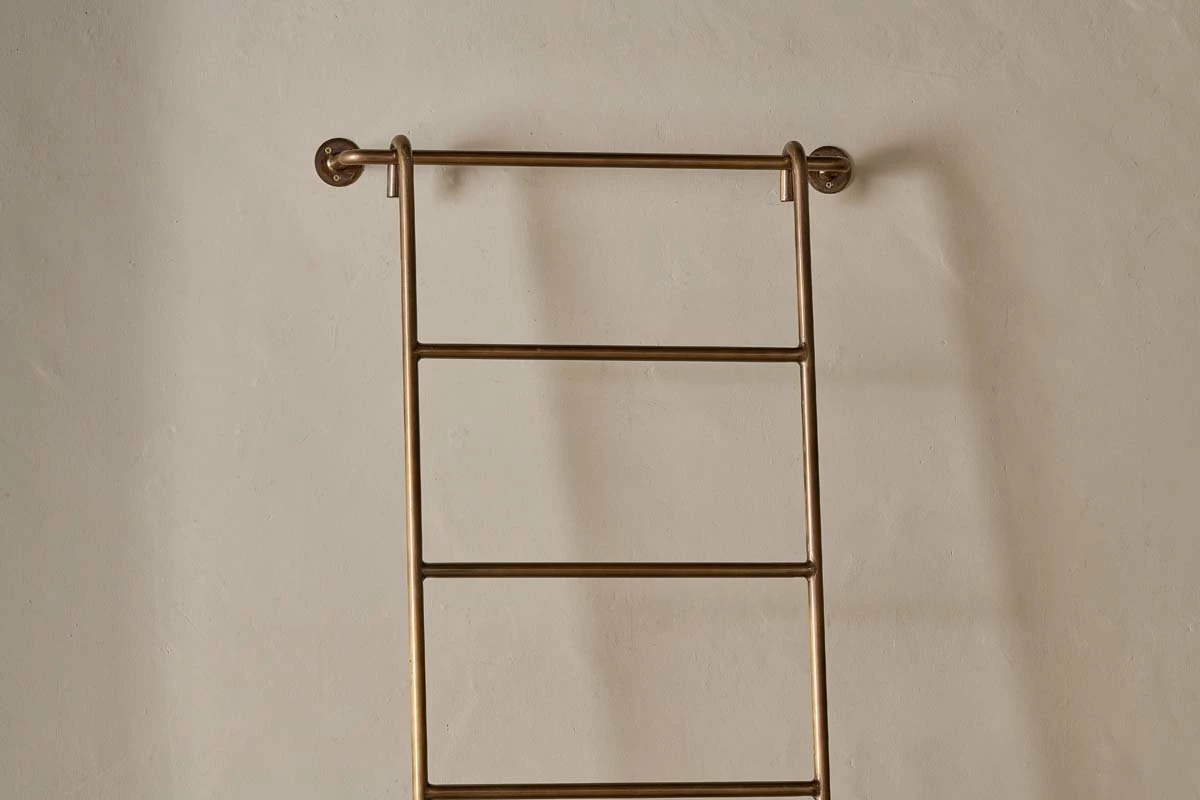 The Temur brass decorative ladder offers a stylish solution to carry out a practical function. Crafted from solid iron and finished in a warm, golden brass tone, the ladder comes with a rail that fixes to the wall, where the ladder itself neatly slots into the rail providing a secure a stylish towel stand. The Temur ladder is the perfect addition to a bathroom or utility, adding a touch of elegance to a functional space.