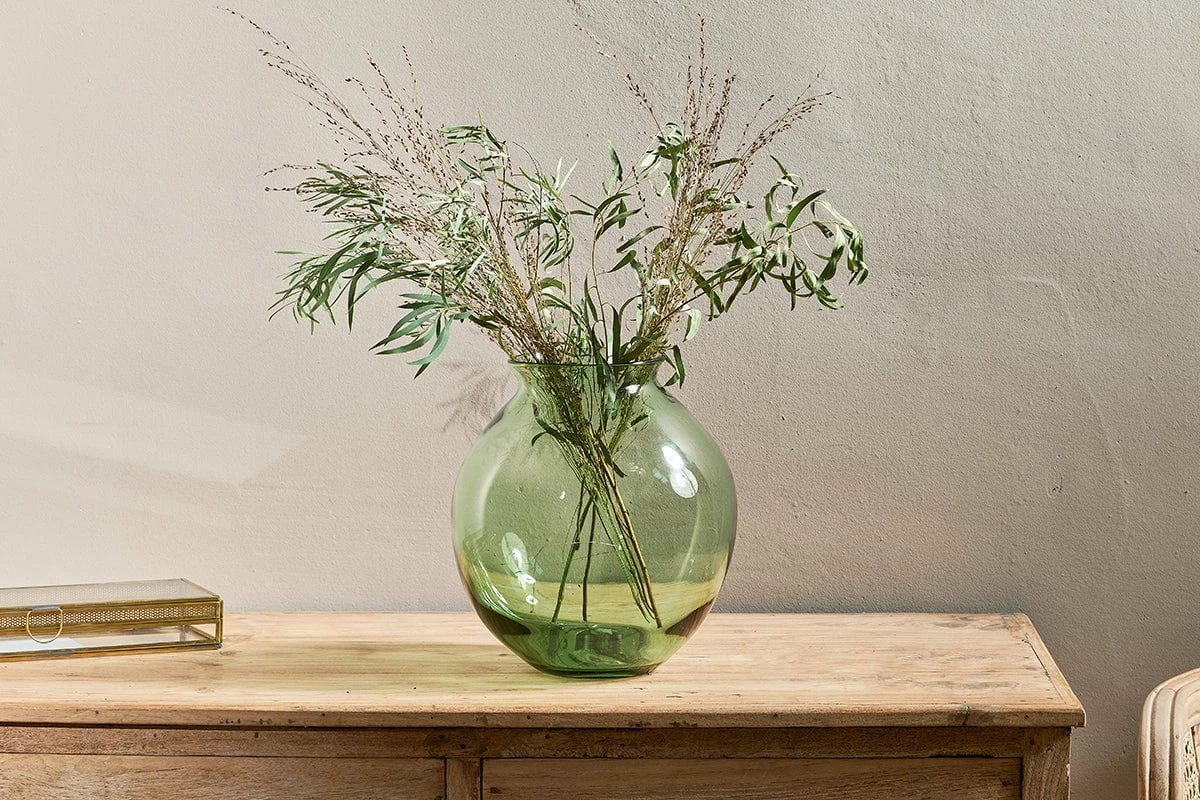 The soft tint of green complements the Vanita vase collection perfectly. These elegant coloured glass vases share an organic and natural look. Timeless and versatile, the subtle green hued glass has a fresh and clean aesthetic. A fishbowl shape vase is perfect for displaying flowers with more rigid stems and large heads such as peonies, hydrangeas and roses. The general rule is the height of the arrangement should be at least one and a half times more than the height of vase. The practical outward lip not only looks great but ensures the flower stems are supported.