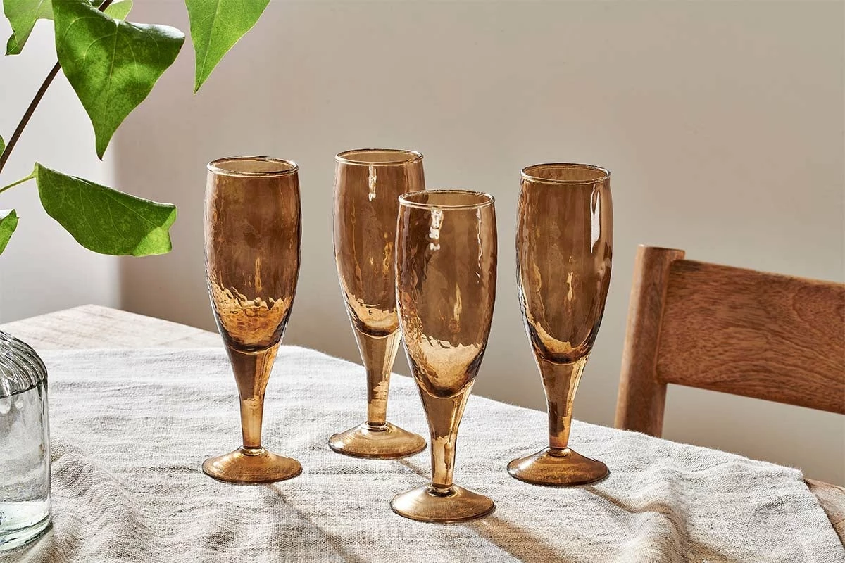 Add a touch of panache to any celebration with our Yala champagne glasses. The warm, smoke brown hue of the recycled glass and their tactile, hammered finish will bring understated elegance to any evening drinks.