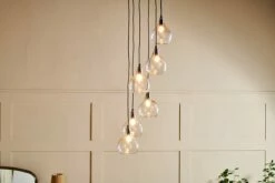 The Zia statement cluster pendant makes a standout centre piece. The collection of six recycled glass tear drop shaped lights at varying heights provides a contemporary alternative to a chandelier. Style them in an entrance hallway or stairwell as a key focal point or display above a dining table. Each of these Zia pendants is made from recycled glass, the black fabric cables affixes to an attractive brass ceiling rose.
